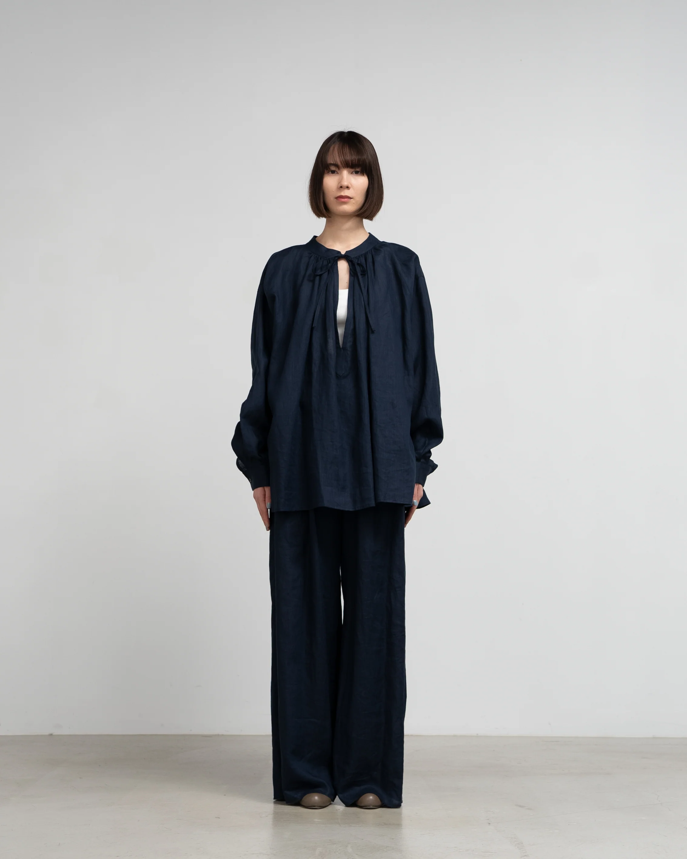 A blouse with a soft, airy silhouette, featuring generous gathers around the deeply cut neckline and designed to be worn both front and back. Crafted from exceptionally fine French linen yarn, which is highly rare and prized. Compared to cotton, it offers superior absorbency and breathability, with a smooth texture that feels gentle against the skin.