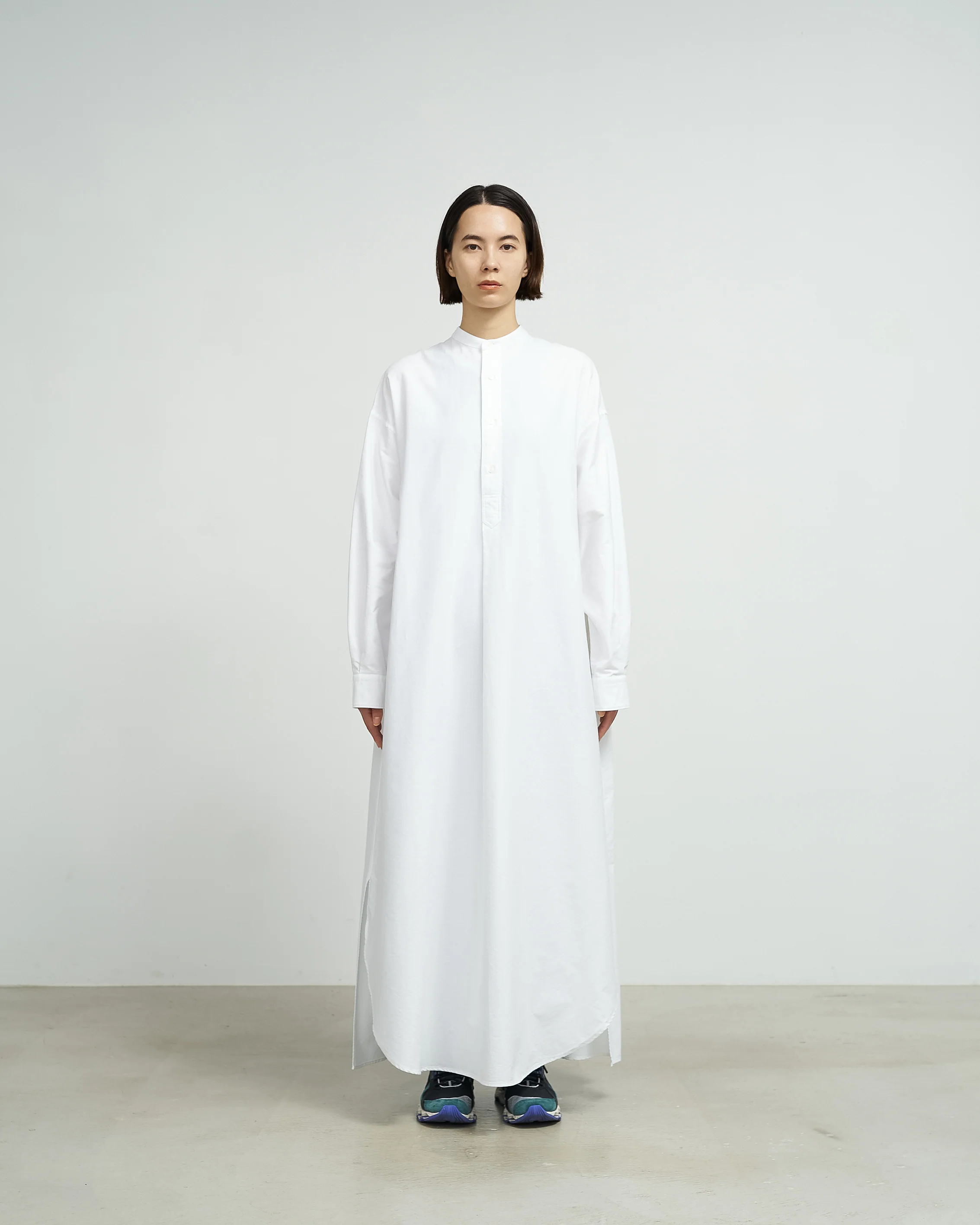 An oversized band-collar dress made from Oxford fabric, featuring an inverted pleat at the back that expands with movement to create an elegant impression. The curved hemline allows for ease of movement, while the fabric has a moderate thickness that helps minimize transparency, especially in darker colors.
