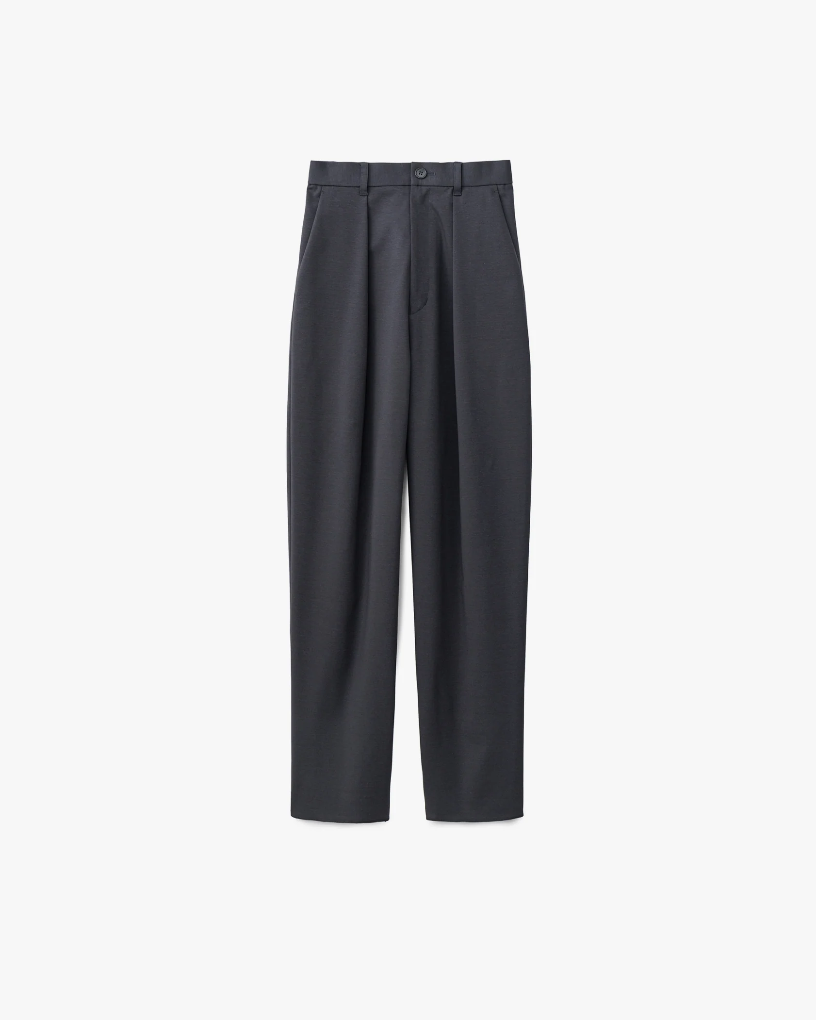 Tapered trousers featuring a comfortable fit with an elasticated back belt and a relaxed hip area. Made from a high-gauge ponte fabric that offers two-way stretch while maintaining the appearance of woven cloth. The deep front tucks at the waist are designed to enhance the look when worn with tops tucked in.