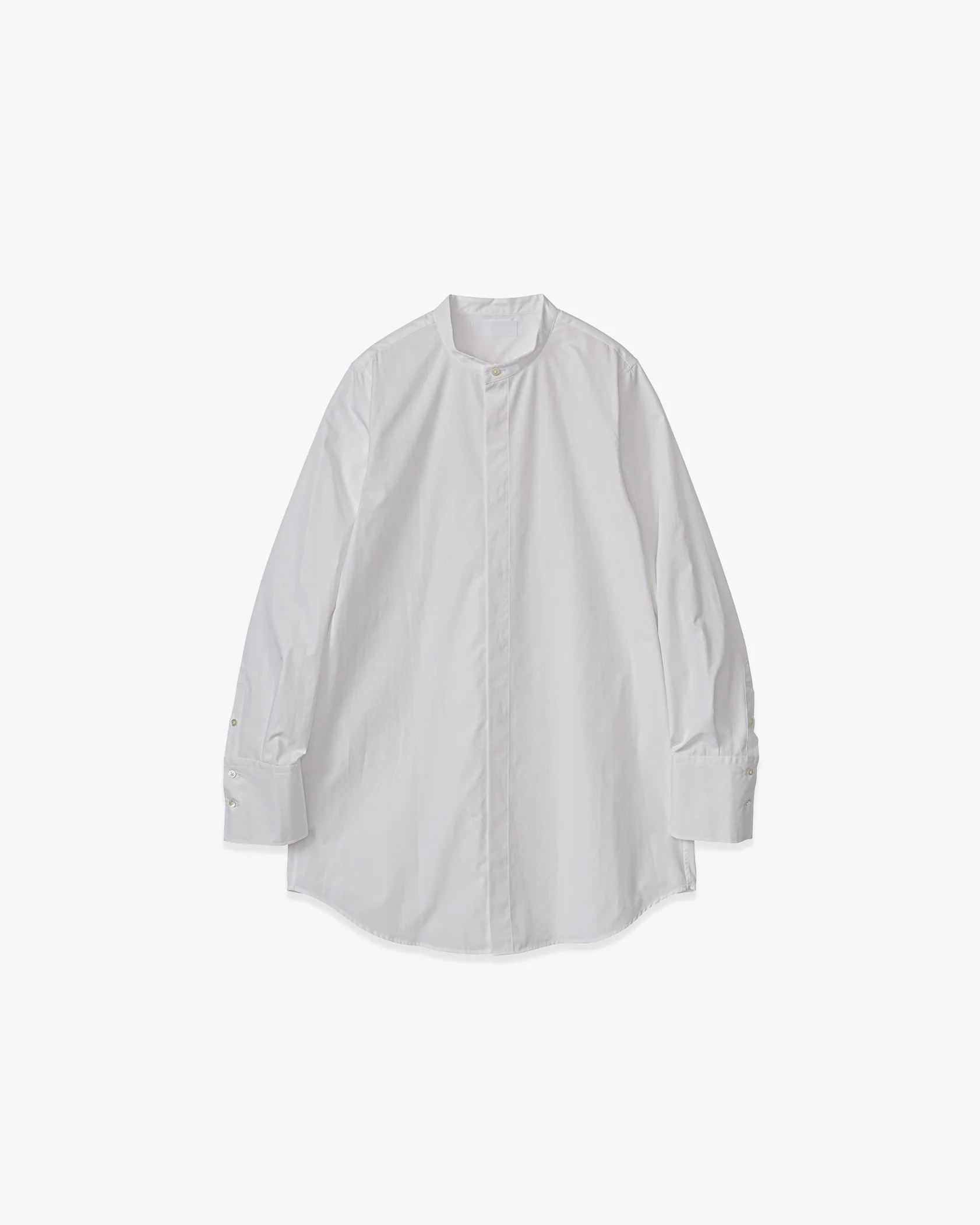 Made from densely woven Supima cotton, extra-long staple for smoothness and durability. Woven close to the maximum density to create a clean surface texture and firm feel. A band collar shirt that features long cuffs and concealed front to accentuate the neckline.