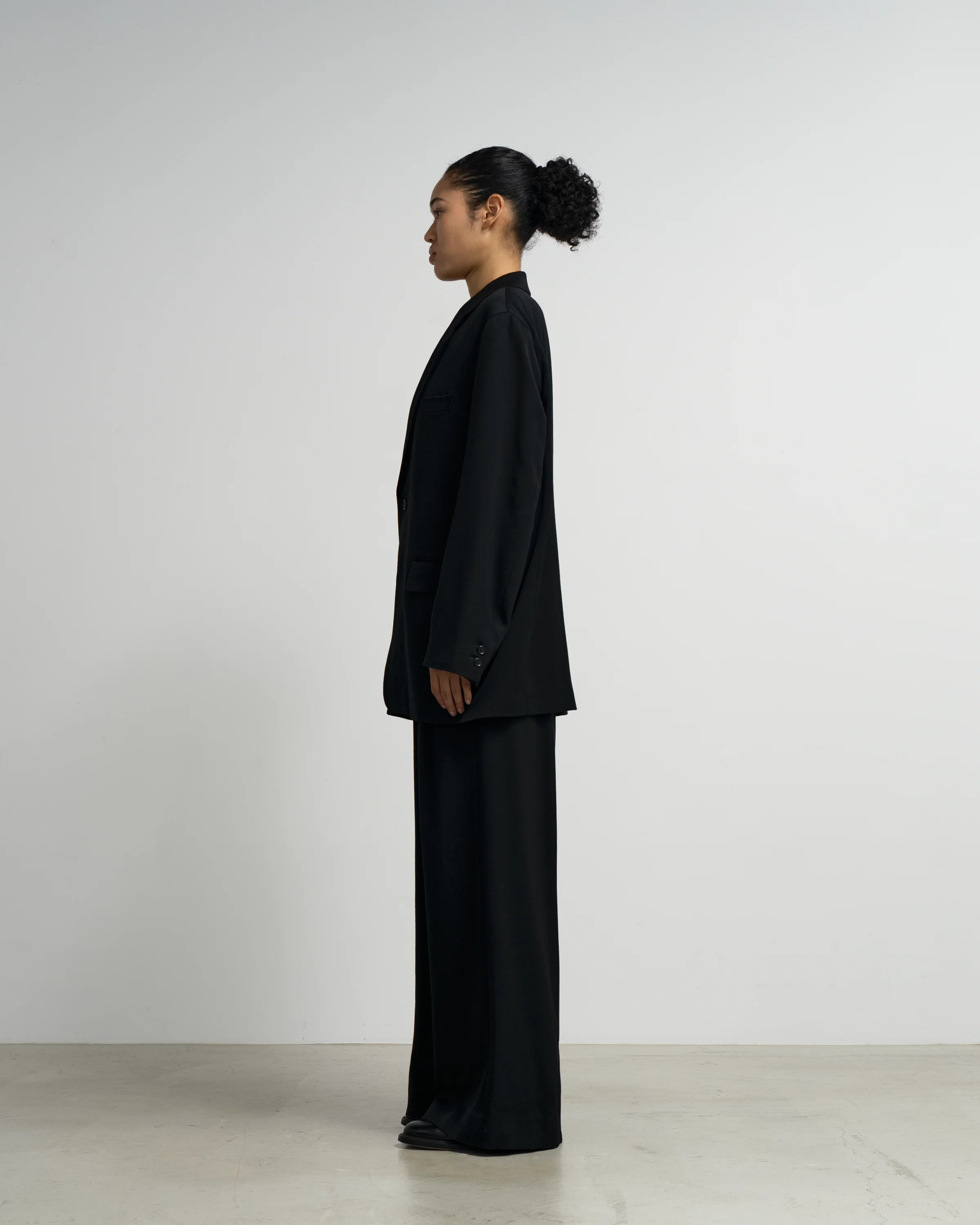 An oversized 2B jacket, made of a satin-weave merino wool doeskin known for it’s density, softness and rich sheen. Featuring an exceptionally deep black as a result of a special dyeing process.