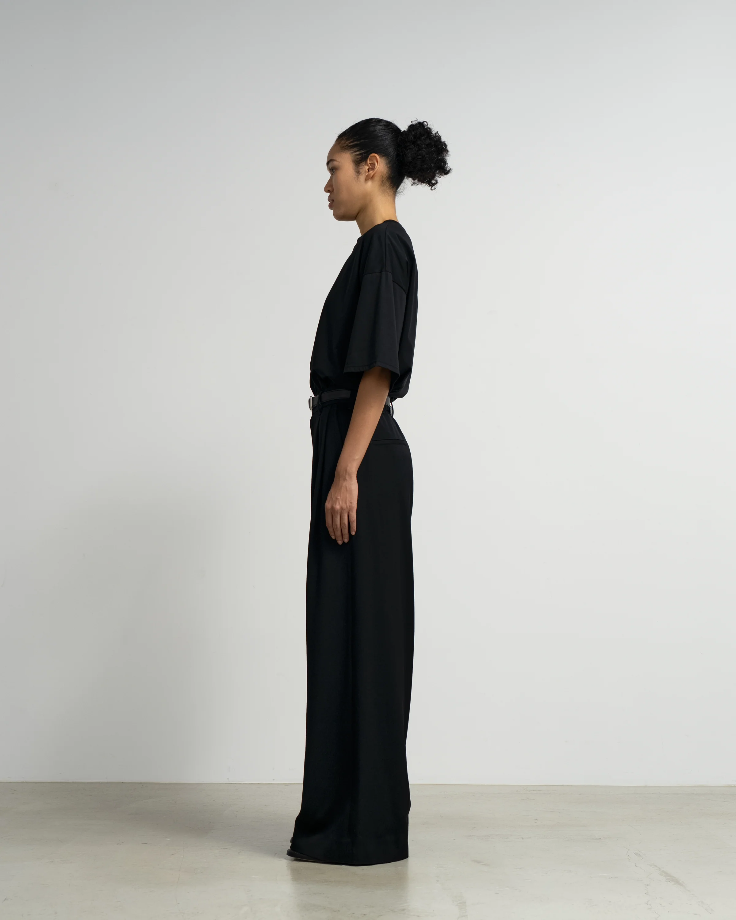 Wide pants, double pleated pants that gently flares towards the hem, feauturing a back elastic waistband for comfort. Made of a satin-weave merino wool doeskin known for it’s density, softness and rich sheen. Featuring an exceptionally deep black as a result of a special dyeing process.