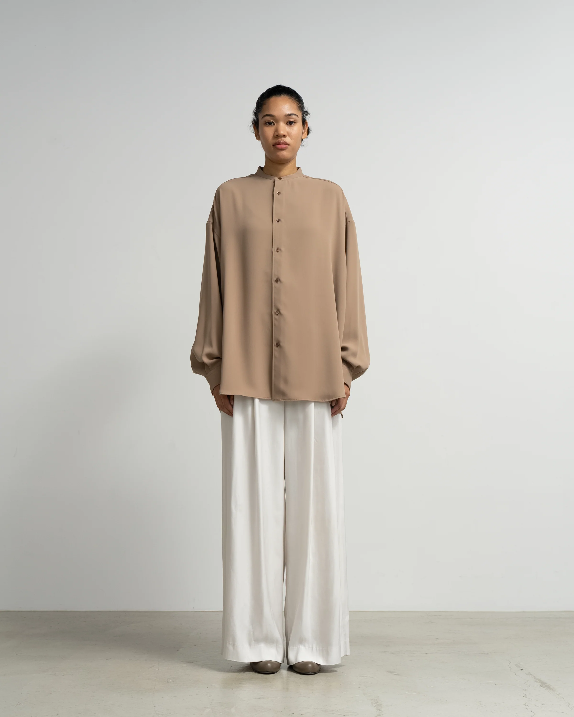An oversized shirt with a band collar, made from soft double satin with a fluid drape. Wrinkle-resistant and practical for everyday wear. The generously cut silhouette sways with movement, creating a beautiful drape. Available in this collection’s color palette.