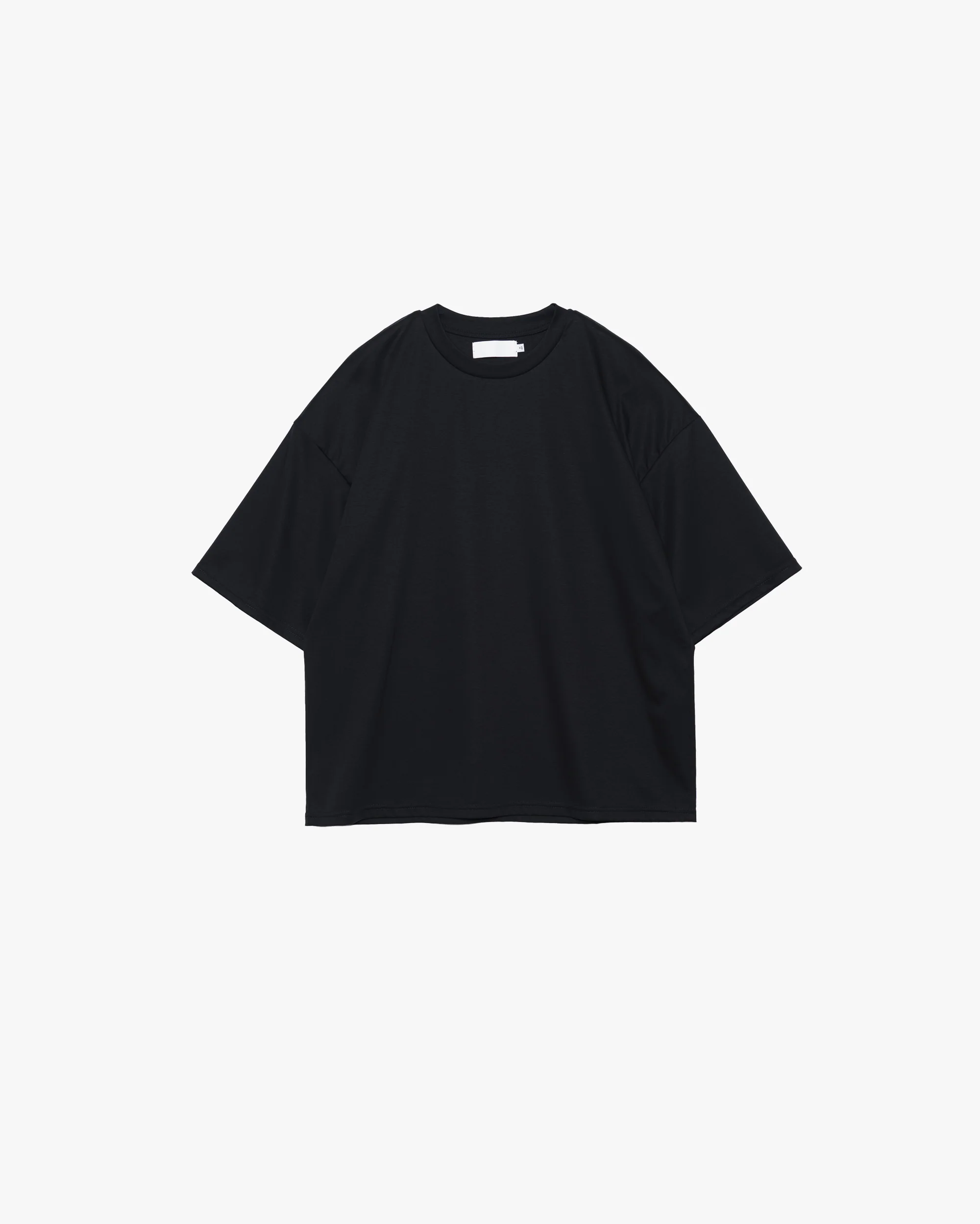 A cropped T-shirt made of a high-gauge, ultra-fine compact cotton yarn with clean and supple texture, achieved using a unique mercerizing process to remove surface fuzz.