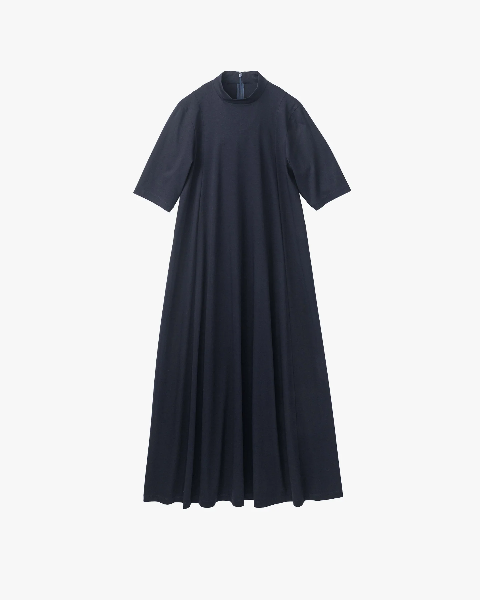 An A-line maxi dress with a cut designed to enhance feminine figures. Made of a high-gauge, ultra-fine compact cotton yarn with clean and supple texture, achieved using a unique mercerizing process to remove surface fuzz.