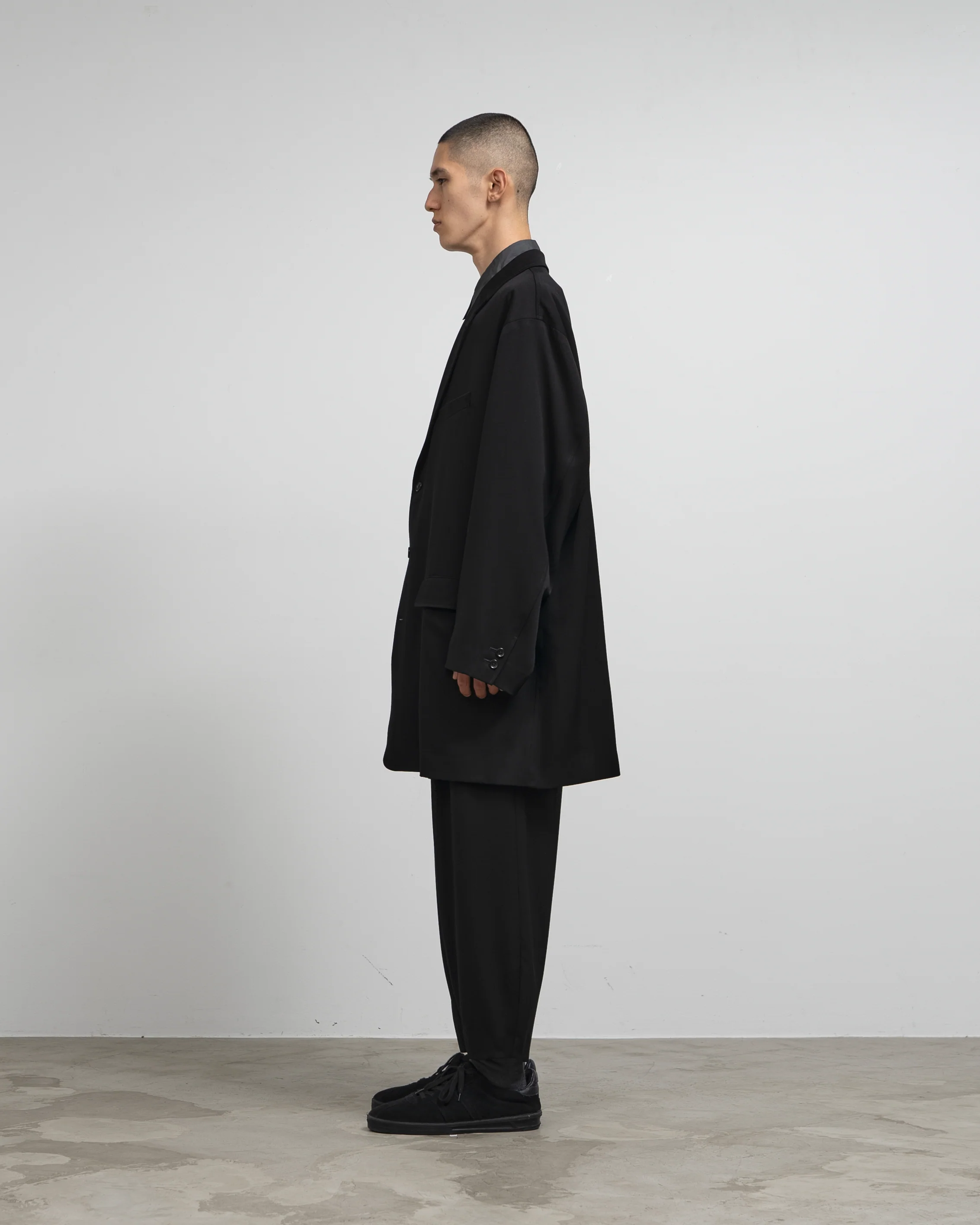 This twill-woven doeskin is made from high-quality merino wool. It's a high-density material, typically used for tuxedos, and is characterized by its softness and sheen. By dyeing it for a longer time than usual and using a deep dyeing process that's "blacker than black," it achieves a sharper, deeper black color and a soft texture. This tailored jacket features a relaxed fit, a large collar, and striking drop shoulders. Its long length also makes it suitable for use as a short coat.