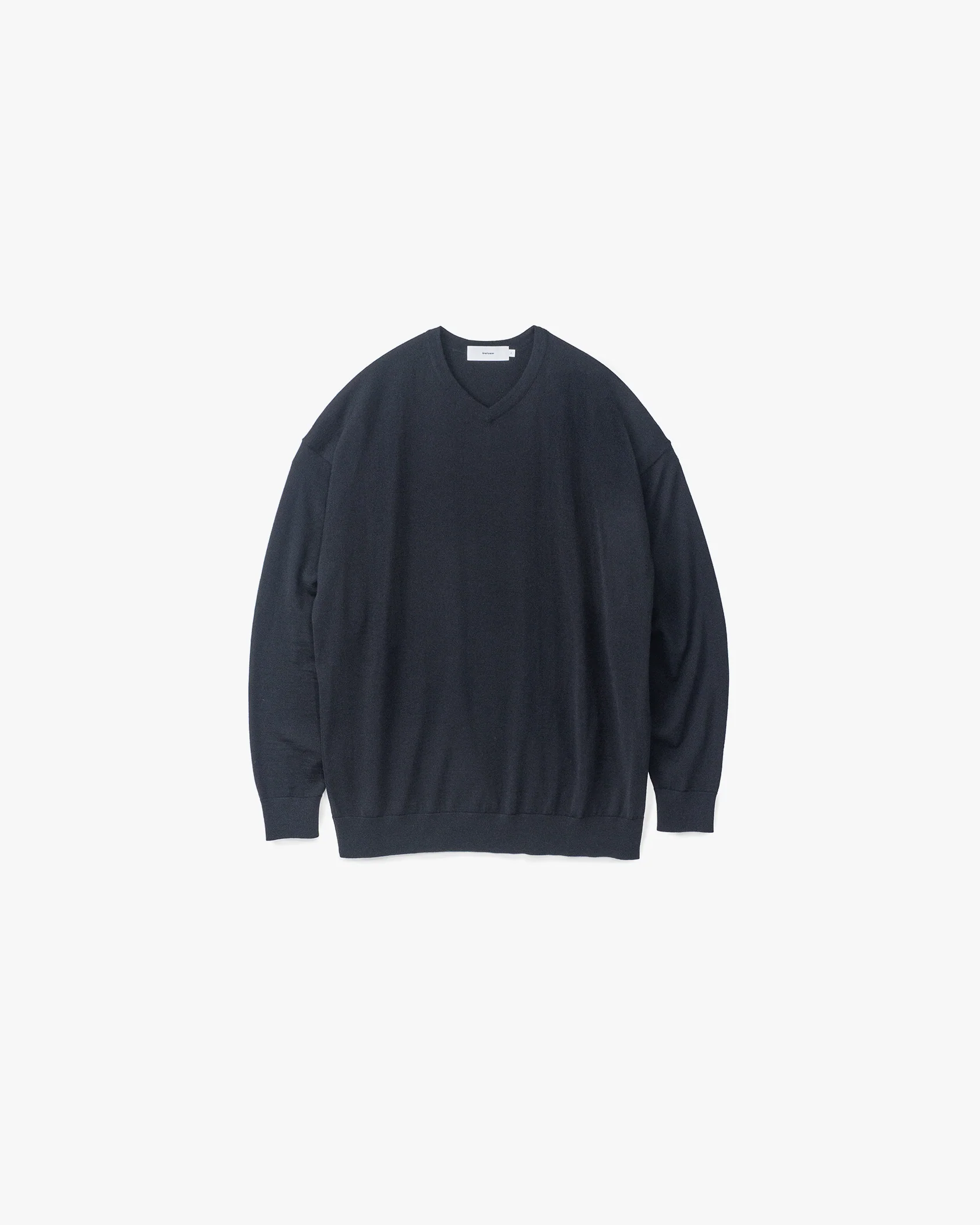 A V-neck knit crafted using an extremely rare high-gauge knitting machine made by Scheller, a German manufacturer with only a few units available in Japan.