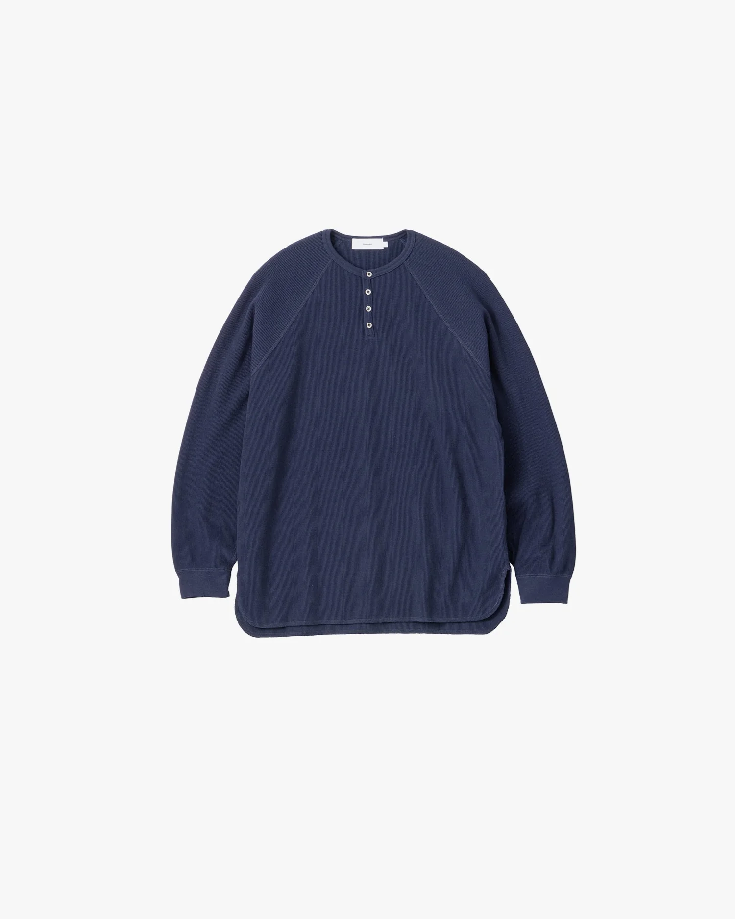 A relaxed-fit long-sleeve Henley neck T-shirt designed to create a clean neckline.