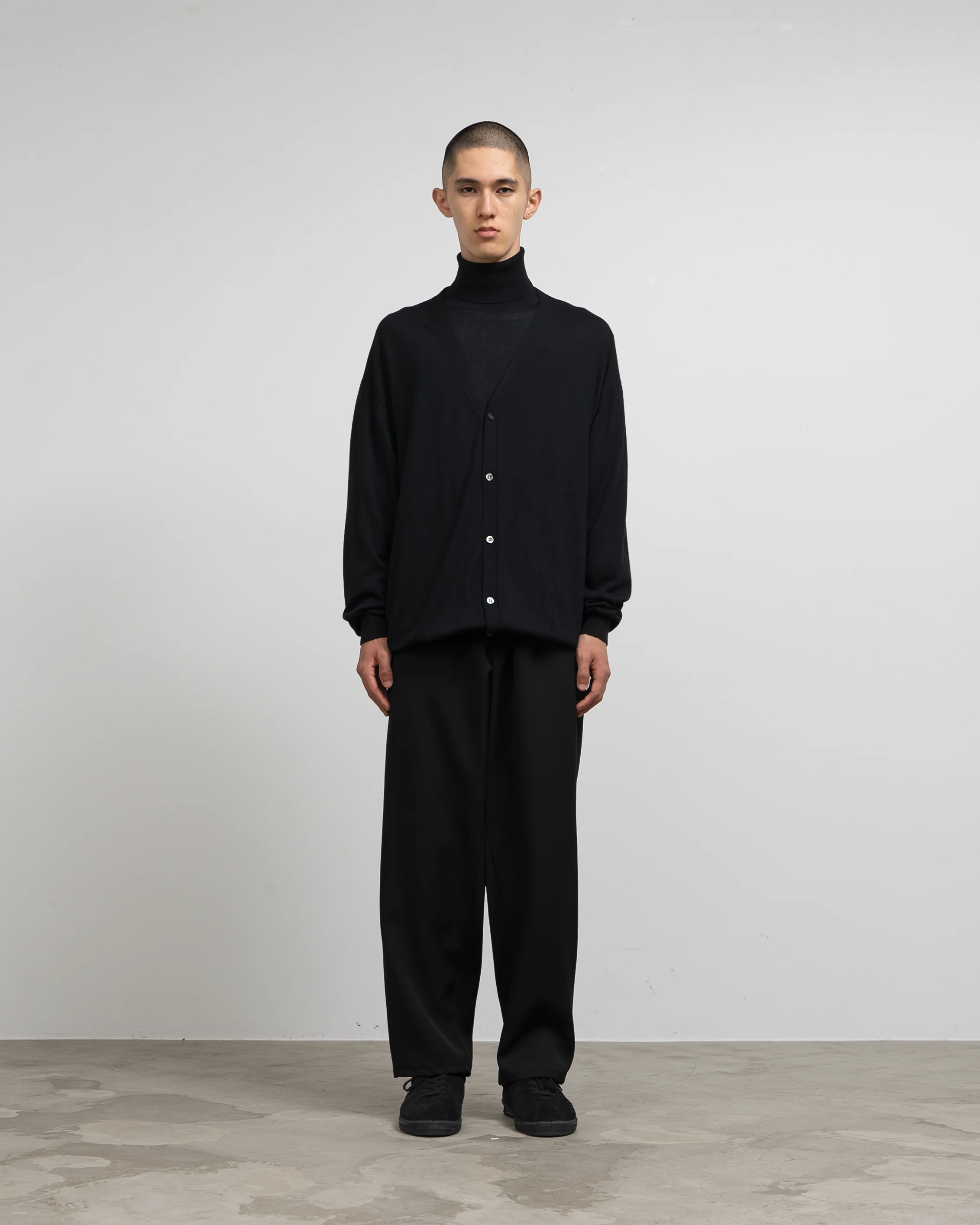 A cardigan with a moderately voluminous silhouette. Knitted at 18 gauge using ultra-fine SUPER 140’s wool yarn, it features a natural sheen and a smooth texture derived from the fiber’s rich oil content.