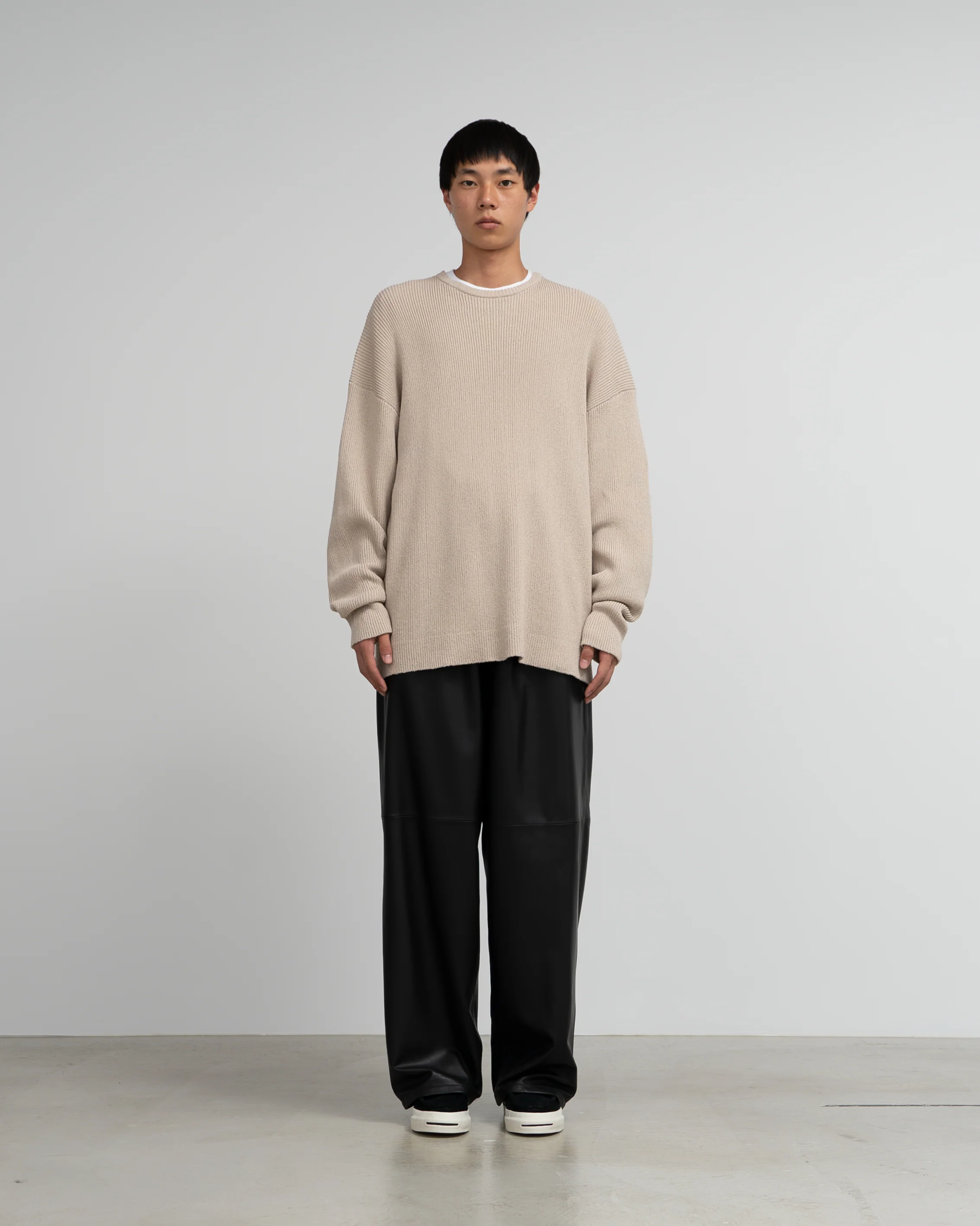 A low-gauge crew neck sweater with plenty of volume. Made with a coarse knit that combines the natural texture and dry touch of linen with the elasticity and shape stability of synthetic Solotex.