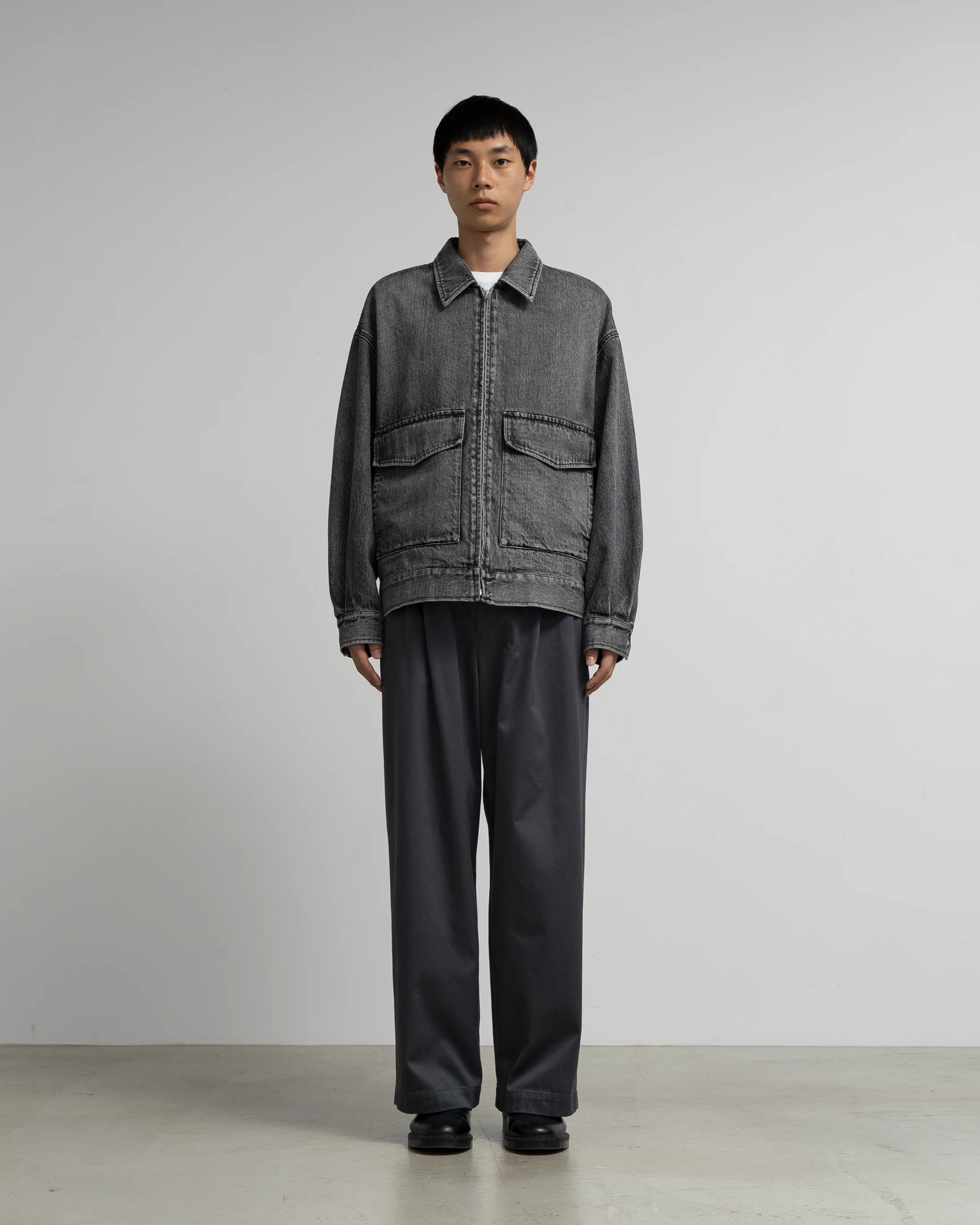 A front zip jacket with a cropped legnth, dropped shoulders, and pleated sleeves.