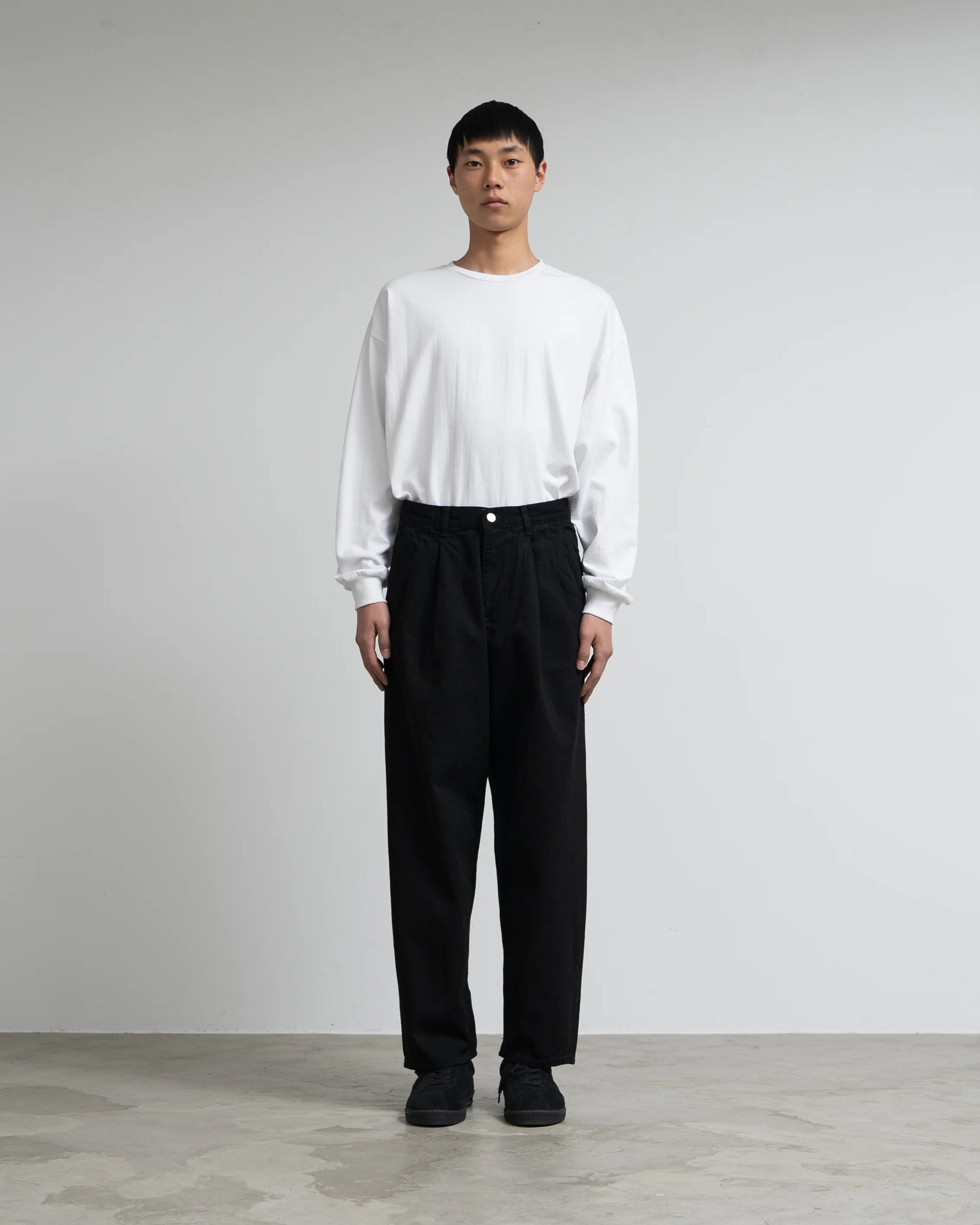 These jeans feature a wide, tapered fit with pleats and darting at the waist.